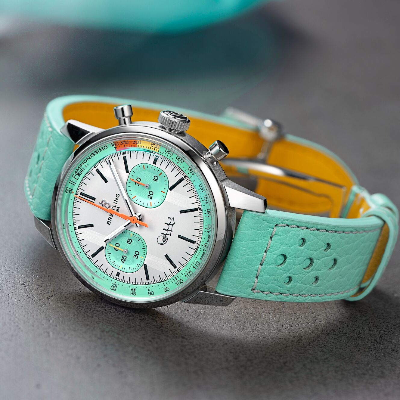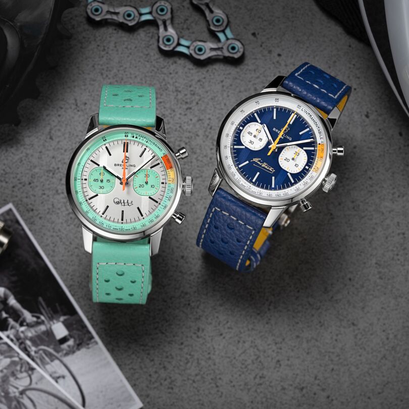 Zwei Chronographen, zwei Charaktere – und ein gemeinsames Erbe, das Sportgeschichte schrieb: Mit den limitierten Top Time B01 Fausto Coppi und Top Time B01 Gino Bartali feiert Breitling nicht nur zwei italienische Radsportlegenden, sondern auch den rebellischen Spirit der Top Time aus den 1960er-Jahren. Die Coppi-Edition setzt auf ein weißes Zifferblatt mit türkisfarbenen Totalisatoren, orangefarbenem Blitzzeiger, seinem Spitznamen „Il Campionissimo“ auf der Skala und seiner Signatur bei sechs Uhr. Die Bartali-Variante zeigt sich in Tiefblau mit gelben Akzenten, dem Schriftzug „L’intramontabile“ und seiner Unterschrift – ein stilvoller Tribut an zwei unvergessene Persönlichkeiten. Angetrieben vom COSC-zertifizierten Manufakturkaliber B01, verbinden beide Modelle präzise Technik mit ausdrucksstarkem Design – und setzen ein sportlich-elegantes Statement mit Geschichte.
