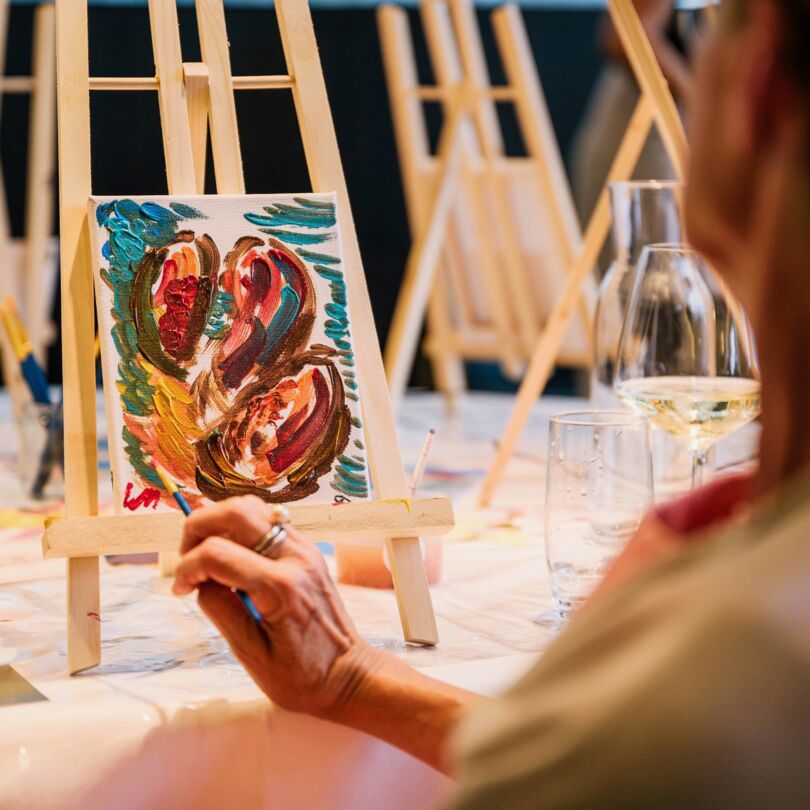Ein besonderes Highlight des Abends war der kreative Programmpunkt mit OhBetterTogether: Unter freiem Himmel konnten die Gäste kleine Kunstwerke auf Mini-Leinwänden gestalten – mit Acrylfarben, viel Fantasie und jeder Menge Spaß. Ob abstrakte Farbspiele oder kleine Botschaften – die Kunstwerke waren so individuell wie ihre Schöpfer:innen und verliehen dem Abend eine persönliche, künstlerische Note.