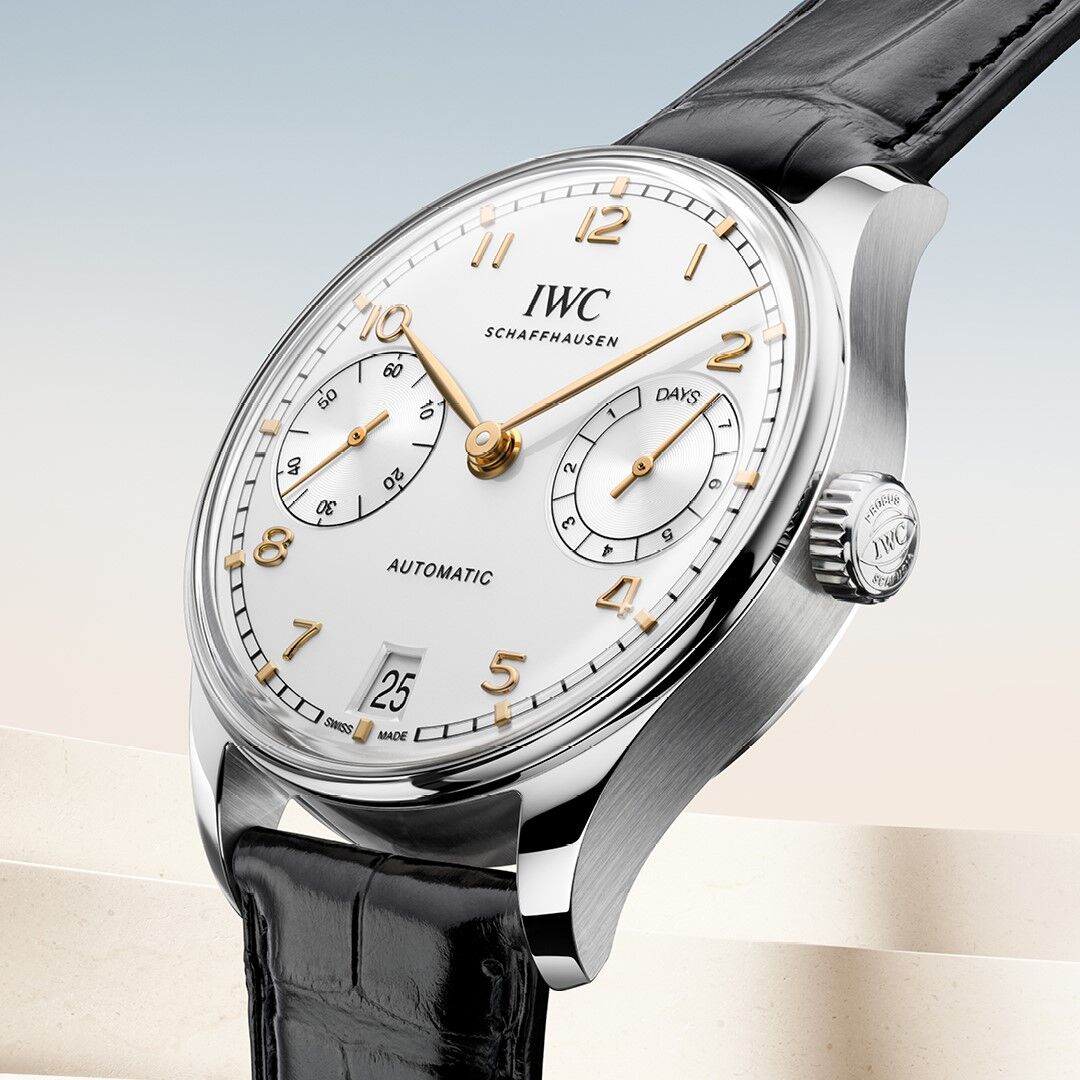 Die IWC Portugieser Automatic 42 bewahrt mit ihrem überarbeiteten Gehäuse und dem doppelt-kastenförmigen Saphirglas das Erbe der ursprünglichen Portugieser aus dem Jahr 2000. Die Zifferblattfarbe Silver Moon soll das Schimmern des Mondes einfangen und ein leises Funkeln widerspiegeln, das die Unendlichkeit der Zeit symbolisiert.