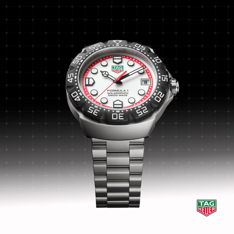 Die TAG Heuer Formula 1 Solargraph vereint das ikonische Design der 1980er-Jahre mit moderner Technologie und echtem Motorsport-Flair. Das 38-mm-Gehäuse aus sandgestrahltem Edelstahl trifft auf ein weißes Opalin-Zifferblatt, präzise gefertigte Zeiger, markante Super-LumiNova®-Indizes in Schildform und eine bidirektionale „Daisy“-Lünette aus ultraleichtem TH-Polylight mit samtiger Oberfläche. Ein überarbeitetes Armband sorgt für dynamischen Tragekomfort – inspiriert vom Gefühl auf der Rennstrecke. Dank hervorragender Ablesbarkeit bei allen Lichtverhältnissen und dem charakteristischen Klick der Lünette bringt dieses Modell echtes Racing-Feeling direkt ans Handgelenk.