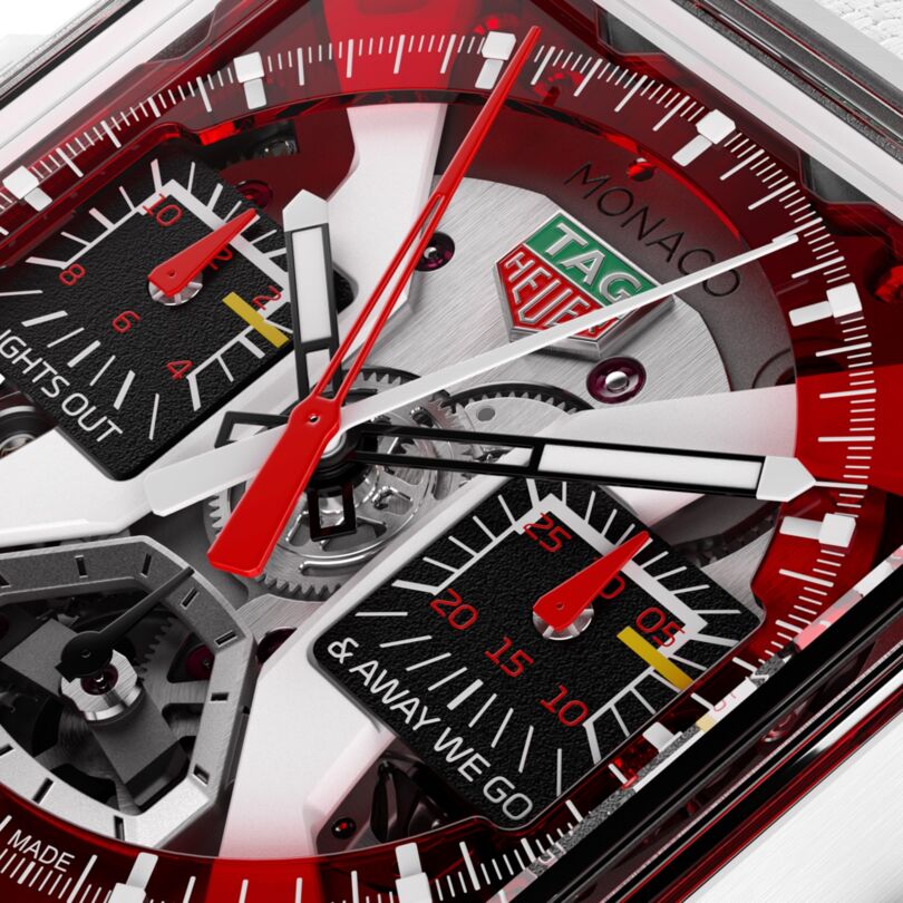 Das rot getönte, transparente Zifferblatt bietet spannende Einblicke in das Uhrwerk des TAG Heuer Monaco Split-Seconds Chronographen | F1® und spiegelt die Dynamik der Rennstrecke wider. Bei 12 Uhr befindet sich ein handlackiertes TAG Heuer-Wappen, während ein dezentes F1®-Logo bei 6 Uhr im Minutenring die Motorsport-DNA des Modells unterstreicht. Die Schleppzeiger-Chronographenzähler zitieren das Design der Startaufstellung und tragen den bekannten Schriftzug „LIGHTS OUT & AWAY WE GO“ – inspiriert durch die legendären Grand-Prix-Ansagen von Sky-Sports-Kommentator David Croft.