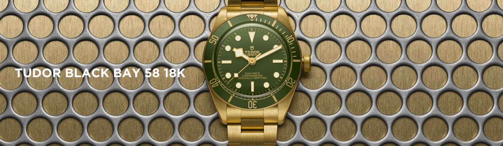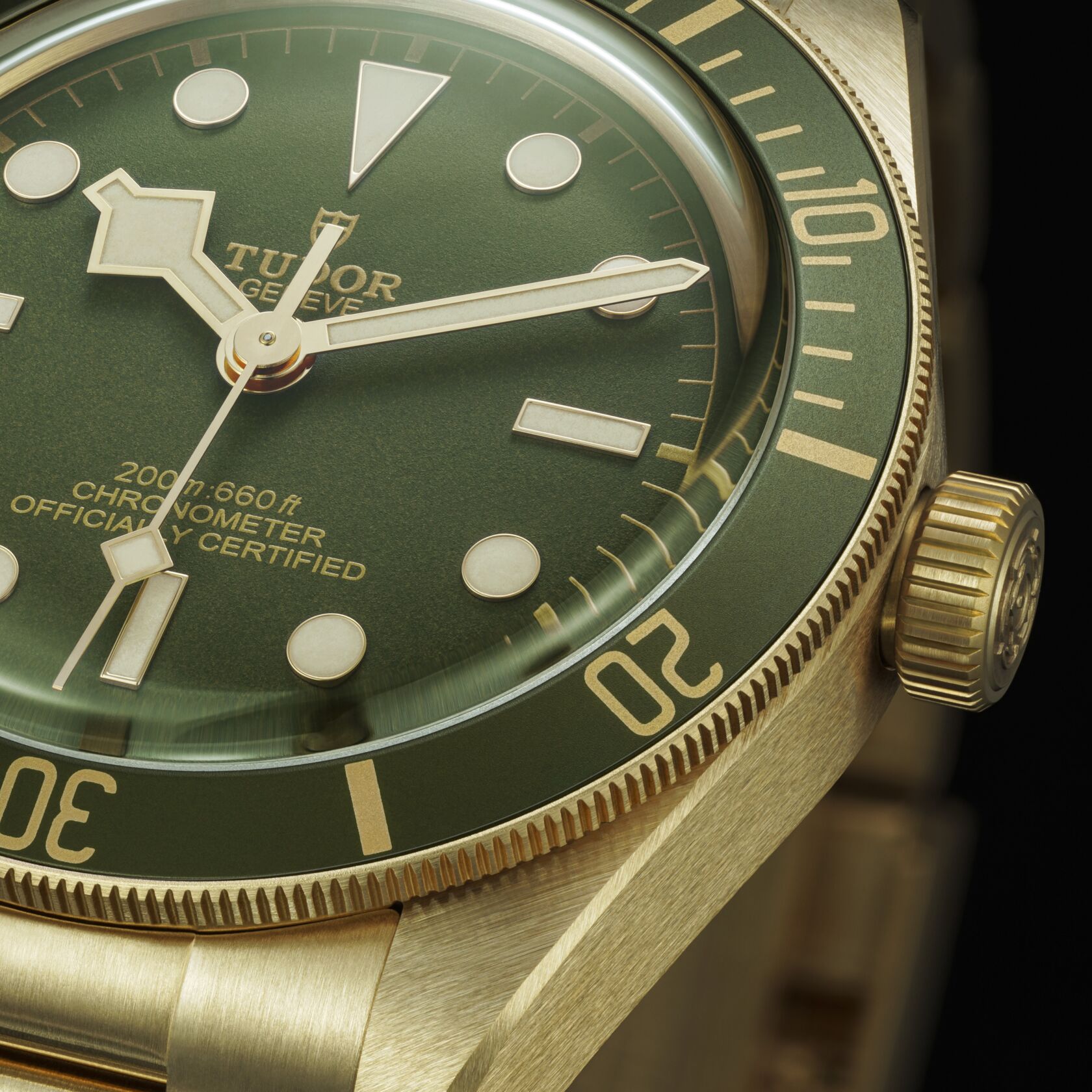 Die neue TUDOR Black Bay 58 18K präsentiert ein satiniertes 39-mm-Gehäuse aus 18 Karat Gelbgold mit einem transparenten Gehäuseboden. Ihr Zifferblatt ist leicht gewölbt und in einem matten Goldgrün gehalten, mit applizierten Stundenindizes in 18 Karat Gelbgold. Diese Neuheit zeichnet sich ebenfalls durch TUDORs charakteristischen Snowflake-Zeiger aus dem Jahr 1969 aus. Die Black Bay 58 18K wird vom Manufakturwerk Kaliber MT5400 angetrieben, das COSC-zertifiziert ist und eine Gangreserve von ca. 70 Stunden bietet. Sie ist mit einem dreireihigen Armband aus 18 Karat Gelbgold mit der TUDOR „T-fit“-Sicherheitsfaltschließe erhältlich.