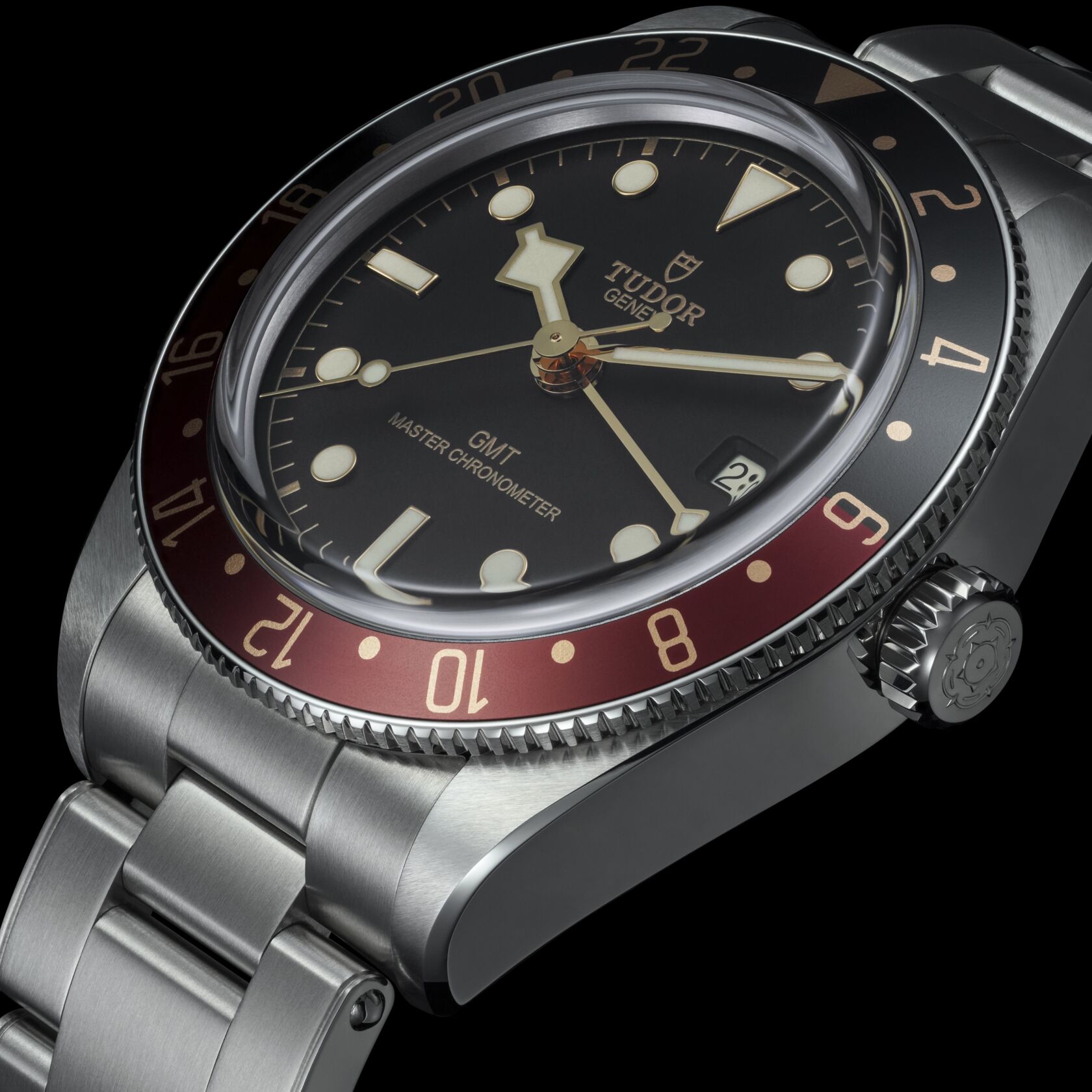 Mit der Black Bay 58 GMT präsentiert TUDOR ein weiteres Modell der Black Bay Linie. Die Uhr erinnert an eine Ära, in der das Reisen durch verschiedene Zeitzonen per Flugzeug eine Neuheit war, eine Ära, die von einem glamourösen und eleganten Stil geprägt war. Ausgestattet mit dem neuen mittelgroßen GMT-Manufakturwerk von TUDOR, verfügt die Armbanduhr über eine Lünette in den warmen Farbtönen Bordeauxrot und Schwarz mit goldenen Akzenten. Das ansprechende Gehäuse der Black Bay 58 hat bereits Standards gesetzt und wird nun in einer GMT-Version angeboten.