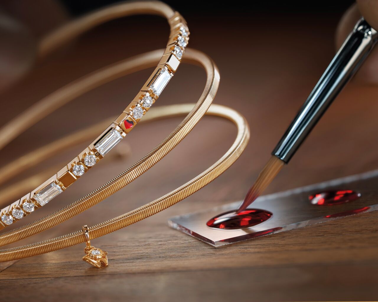 Zum ersten Mal setzt Wellendorff im Armband „Baguette-Zauber“ auf rechteckig geschliffene Baguette-Diamanten – und kombiniert ihre klare Eleganz mit federndem 18-karätigem Gold, feinen Brillanten und einem leuchtend roten Kaltemaille-Herz. 28 perfekt abgestimmte Elemente formen ein harmonisches Gesamtbild, das durch die neue Kordelgeneration „Pures Glück“ doppelt raffiniert wird: Sie erlaubt zwei Tragevarianten und sorgt für unvergleichlichen Komfort. Ein Armband, das Klarheit, Präzision und Gefühl zu einem neuen Schmuckkapitel vereint