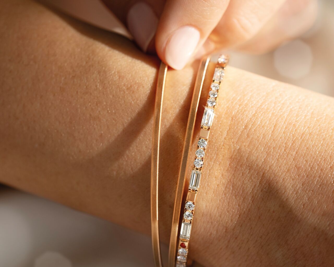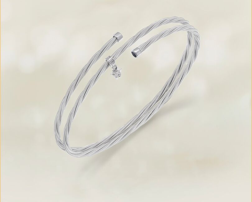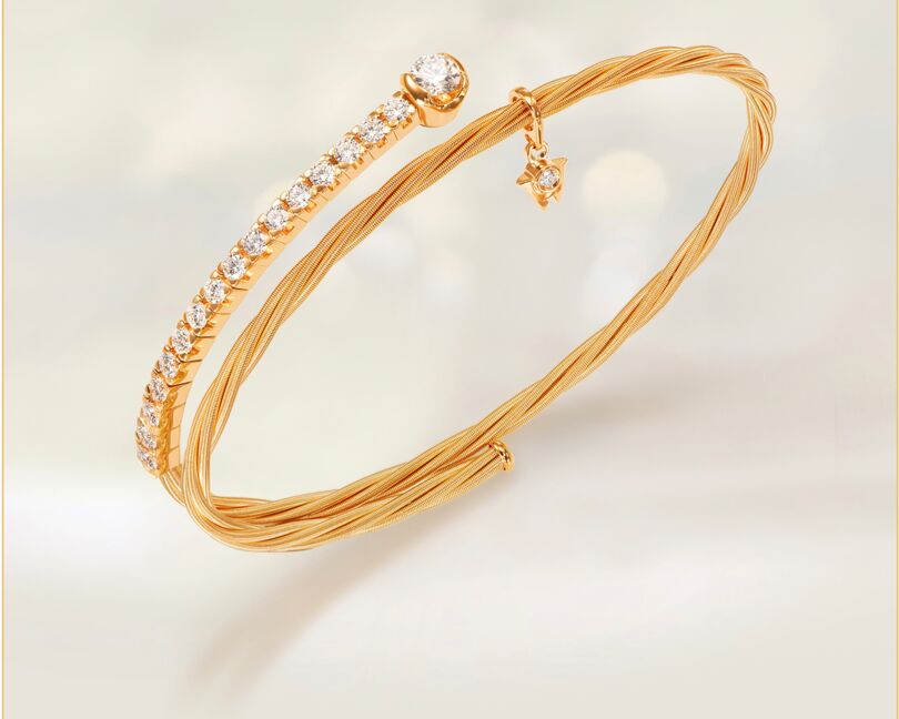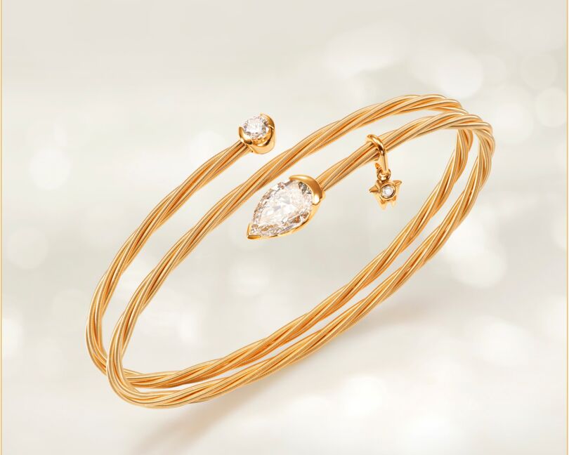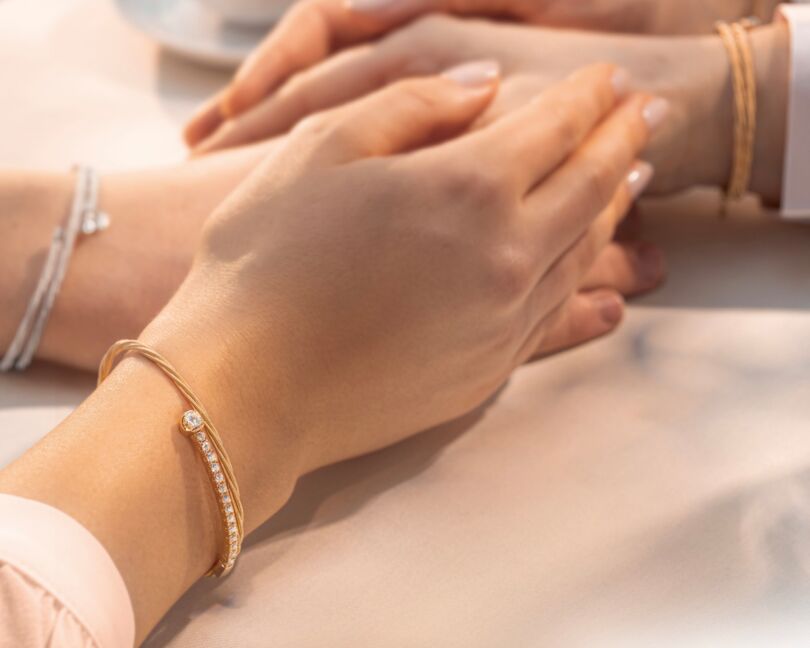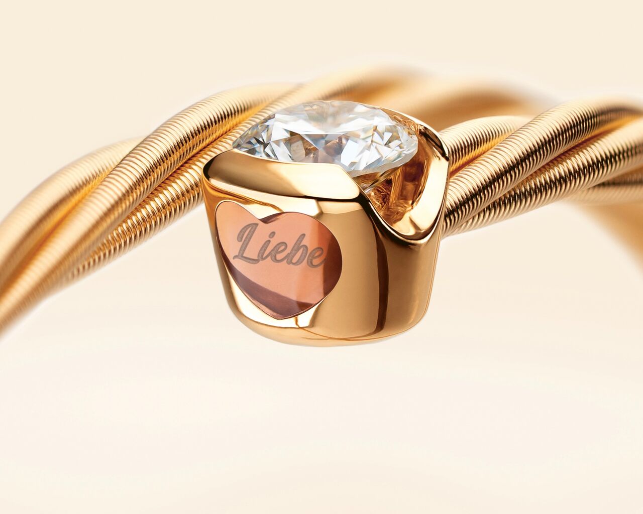 So zart wie nie – und dennoch voller Kraft: Das Armband „Power of diamonds“ umschließt das Handgelenk nur 1,5-mal und bringt dabei eine Brillant-Rivière mit 14 funkelnden Steinen, eine federnde Goldkordel und ein gravierbares Herzdetail aus roséfarbener Kaltemaille zum Strahlen. Ein Solitärbrillant in offener Fassung verleiht dem Armband Leichtigkeit, während innovative Goldschmiedetechnik für sicheren Halt sorgt. Ein edles Schmuckstück mit emotionaler Botschaft – so individuell wie die Trägerin selbst.