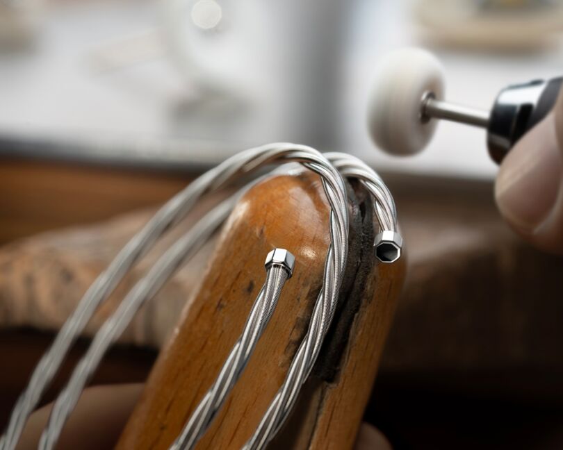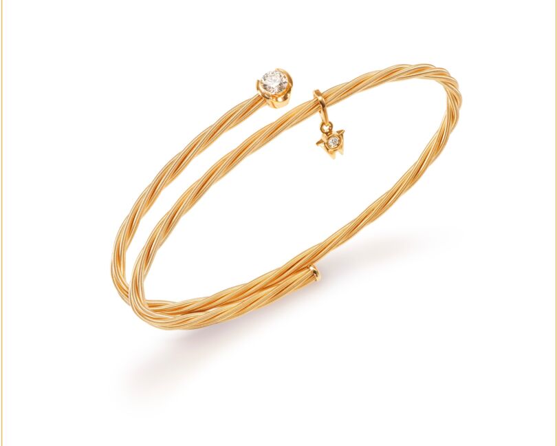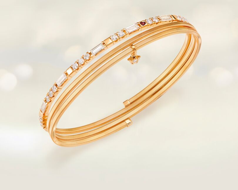 Das wohl intimste Armband der Kollektion: „Power of solitaire“ funkelt mit einem 0,25-karätigen Solitärbrillanten in offener Fassung und einem geheimen Herzdetail aus roséfarbener Kaltemaille. Dahinter verbirgt sich eine gravierbare Goldplatte – ein emotionales Schatzkästchen, gesichert durch eine winzige Schraube. Die seidenmatte, federnde Goldkordel bringt technische Raffinesse und gefühlvolle Leichtigkeit in Einklang – und macht das Armband zu einem stillen Bekenntnis echter Verbundenheit.