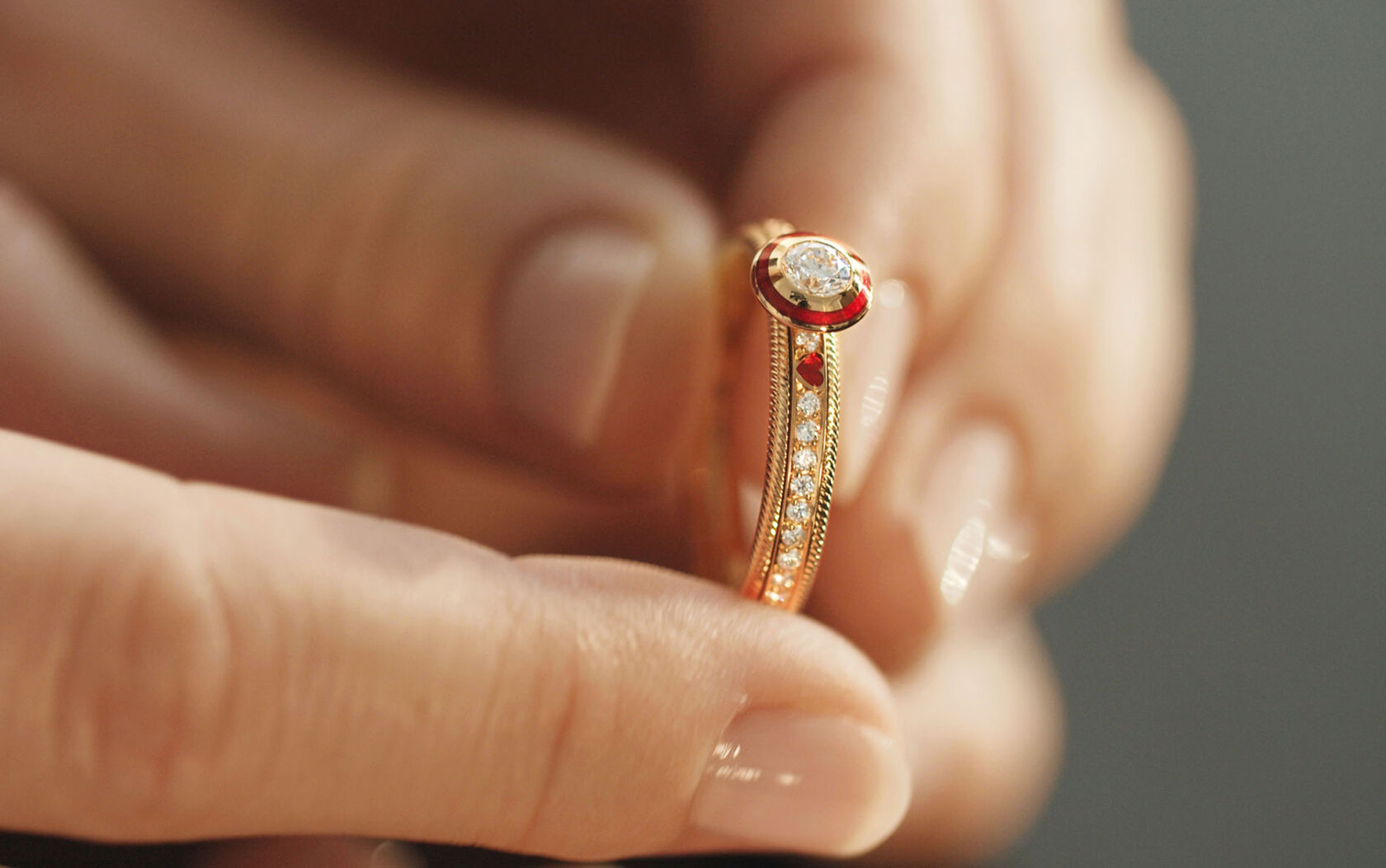 Der Solitär wird rundum von einer schlanken Kaltemaillelinie umrahmt, so erscheint der lupenreine Brillant noch größer. Ein kleines, farbig kaltemailliertes Herz macht den Unterschied: Es erzählt die ganz eigene Liebesgeschichte der Trägerin und erinnert sie mit jedem Dreh an einen Moment der Dankbarkeit und Liebe.
