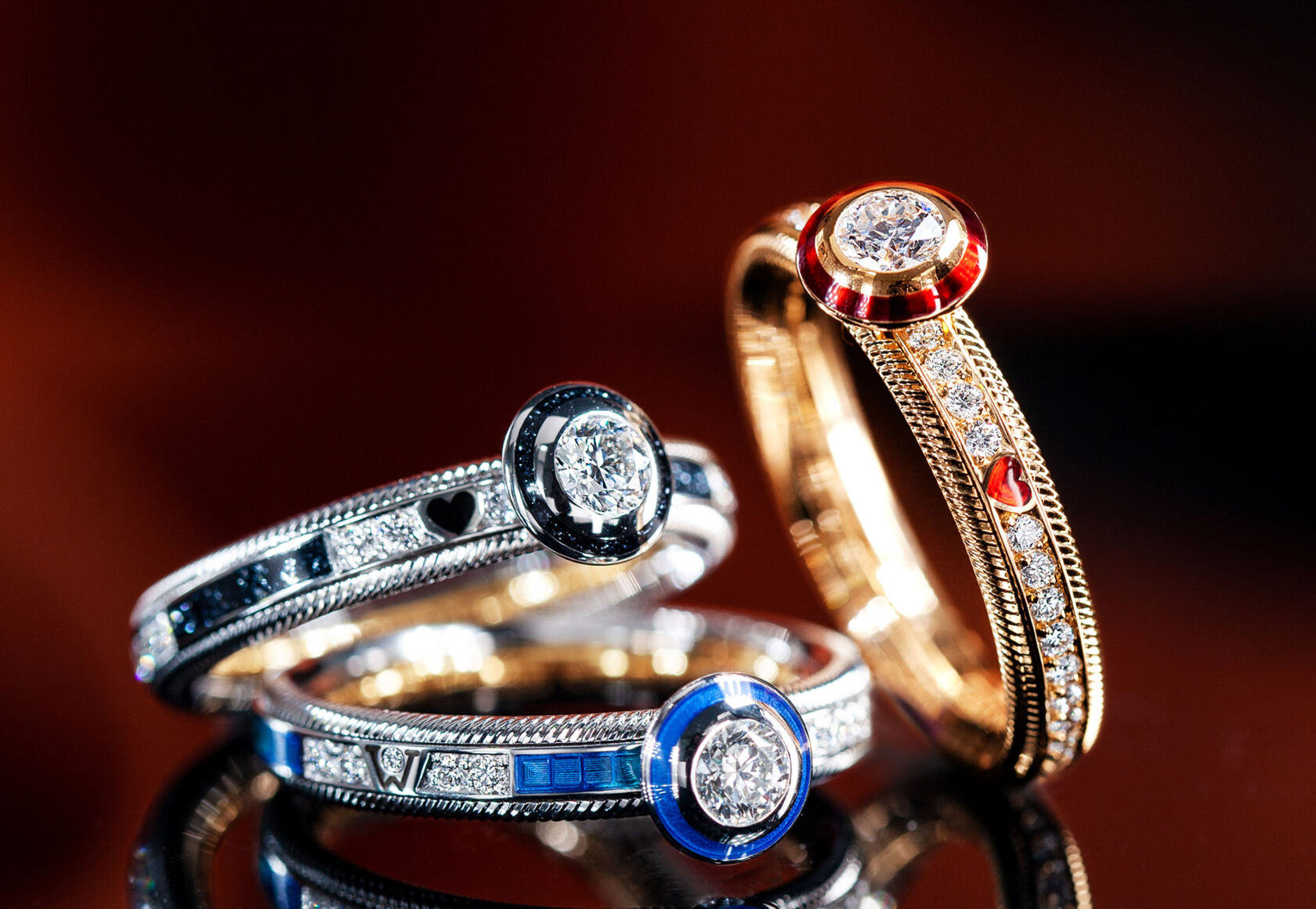 Der Solitärring DANKE FÜR wird in drei verschiedenen Designs gefertigt. Zwei moderne Varianten in 18-karätigem Weißgold kombinieren Brillanten mit farbiger Kaltemaille – entweder in schimmerndem Kristallschwarz oder im Verlauf von Aquamarin bis Blaugrün leuchtend. Ein drittes Design in Gelbgold ist voll mit Brillanten ausgefasst, während das Herz einen leuchtend roten Akzent setzt – einzigartig glamourös. Noch perfekter wird es in Kombination mit Beisteckringen: Während der Solitärring DANKE FÜR sagt, geben die Ringe UNSERE LIEBE und UNSERE ZEIT die passende Antwort – optisch ebenso wie symbolisch.