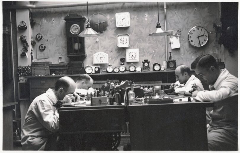 Blick in die Uhrmacherwerkstatt Mitte der 1030er-Jahre