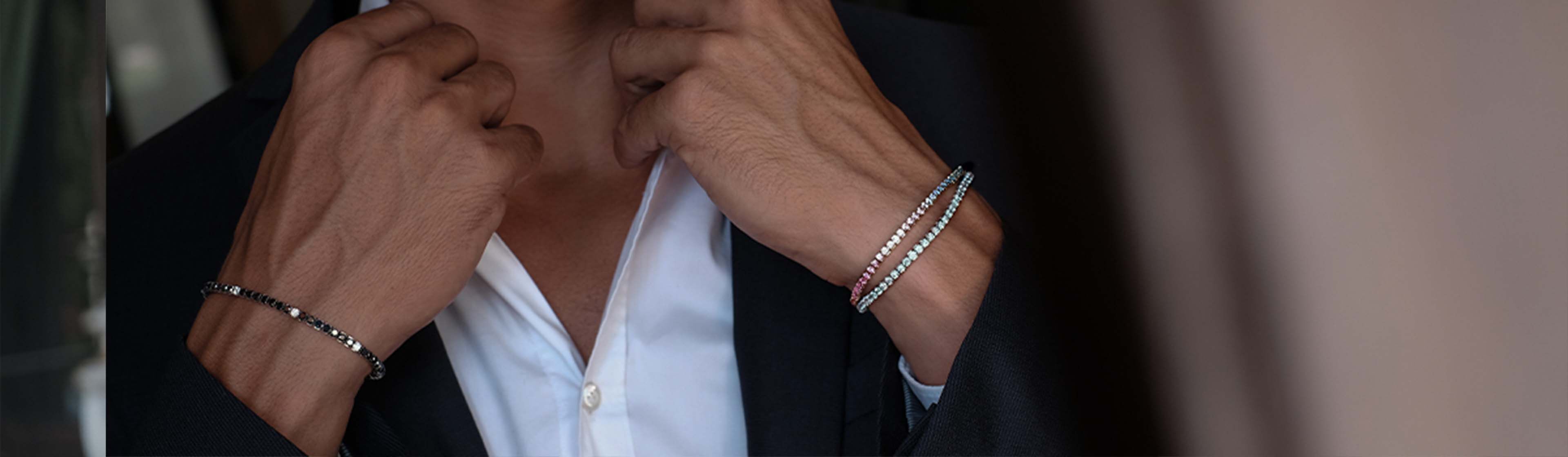 Elastisch, zeitlos, bunt – Je mehr desto besser: Neben den klassischen Tennisarmbändern mit Diamanten, gibt es sie auch in unzähligen Farbedelstein-Variationen – vom bunten Regenbogen über zartes Rosa bis hin zu knalligem Grün – die Vielseitigkeit des Steinmaterials lässt keine Wünsche offen. Sie sind wunderbar kombinierbar mit Uhren und anderen Schmuckstücken – und nicht nur für Frauen sondern auch an Männer-Handgelenken, beispielsweise mit charakterstarken schwarzen Diamanten, ein echter Hingucker.