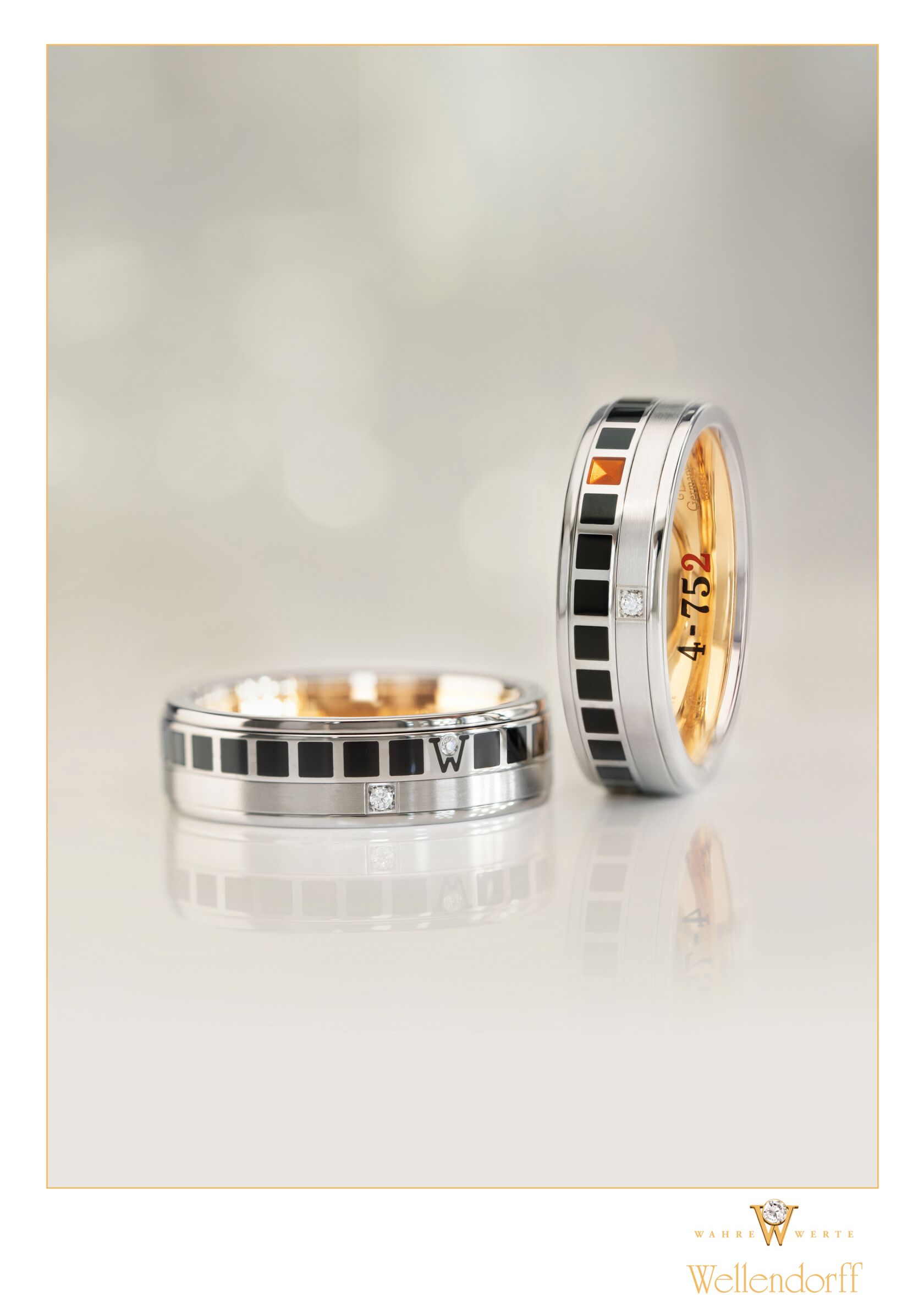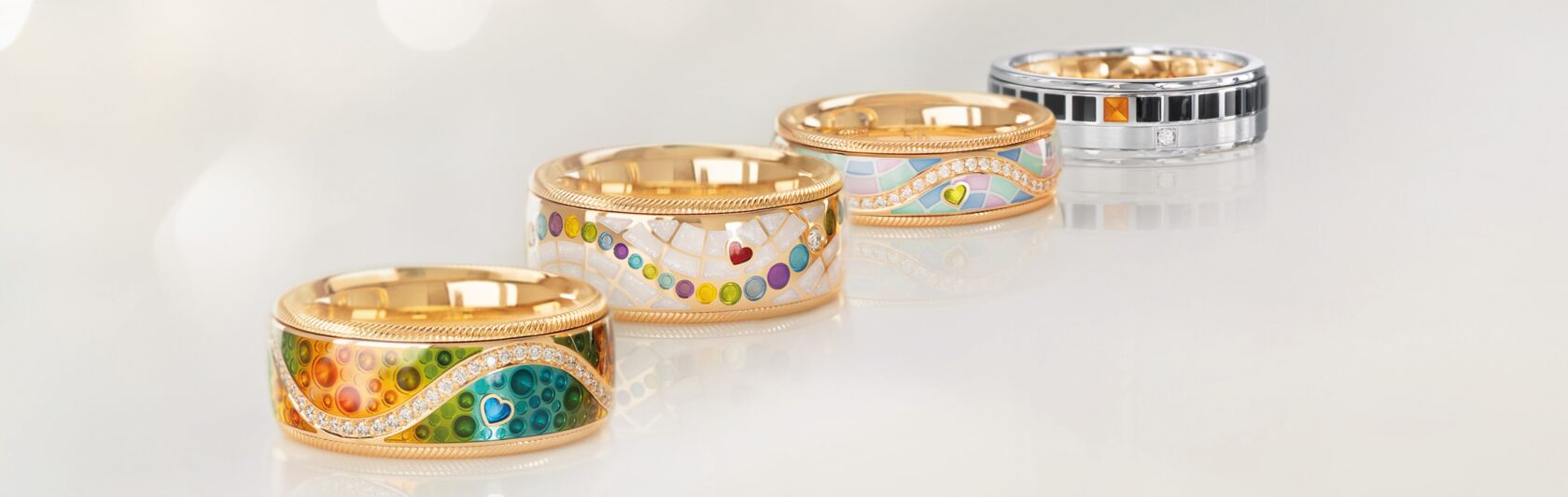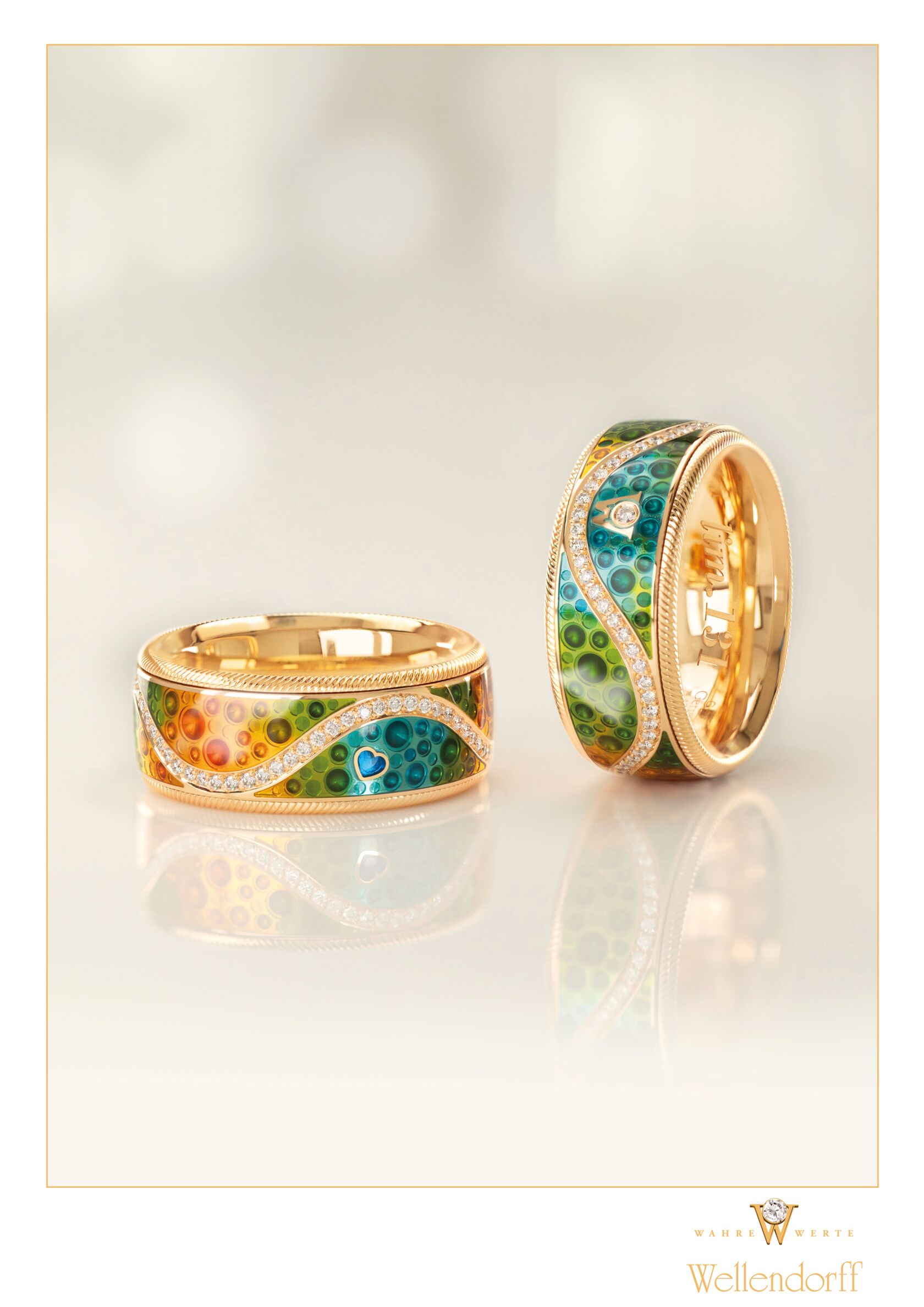 Drei entscheidende Merkmale machen ihn einzigartig: Eine innovative plastische Gravurtechnik schafft konkav gravierte Hohlspiegel, die mit transluzenter Wellendorff-Kaltemaille gefüllt sind, und dadurch das Licht auf eine besondere Weise reflektieren, dem Ring ein strahlendes Aussehen verleihen. Der Einsatz unterschiedlicher Farbgradienten in der Kaltemaille erzeugt einen einzigartigen Farbverlauf, bei dem warme Töne wie Gelborange nahtlos in kühlere Töne wie Türkisblau übergehen.