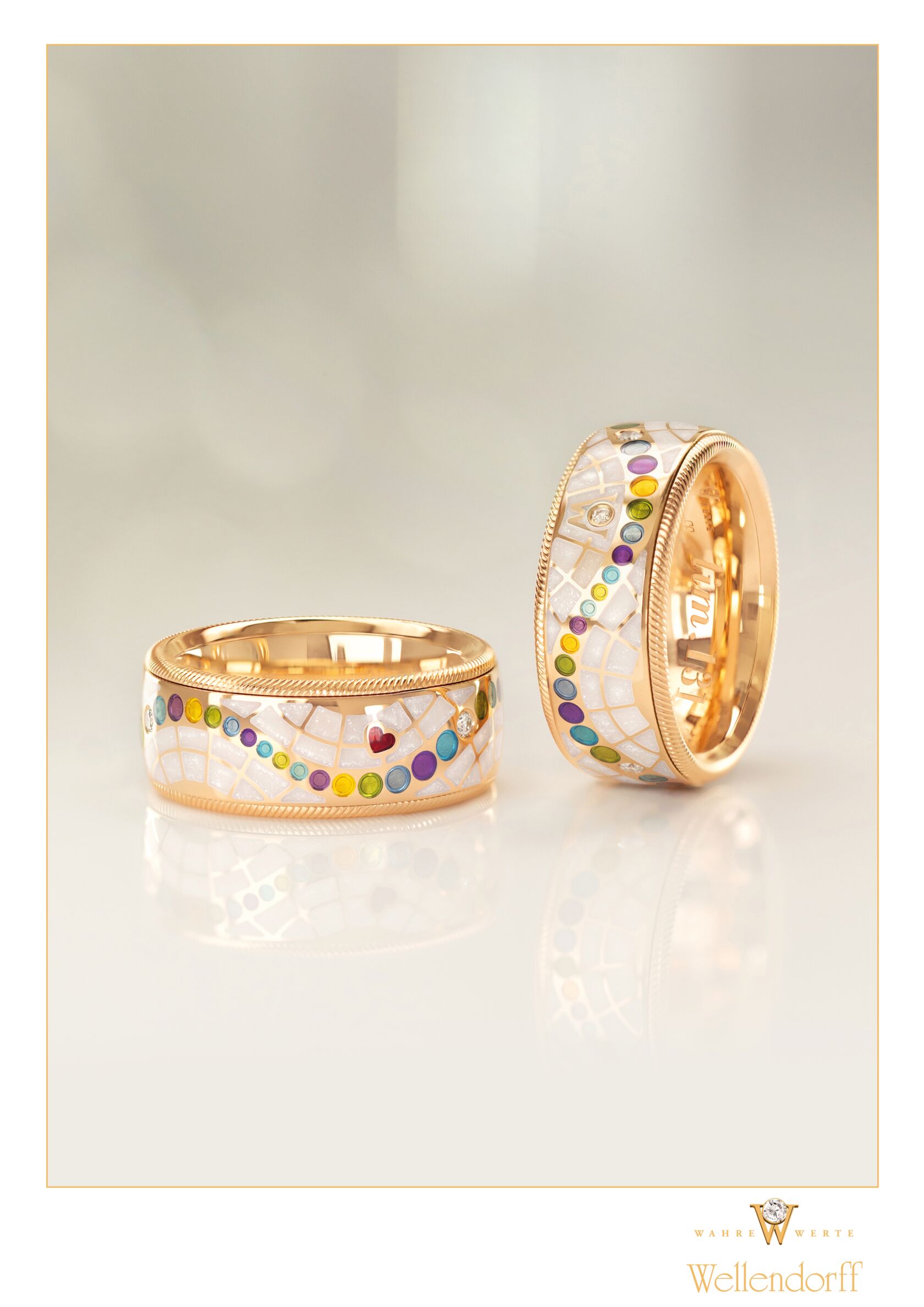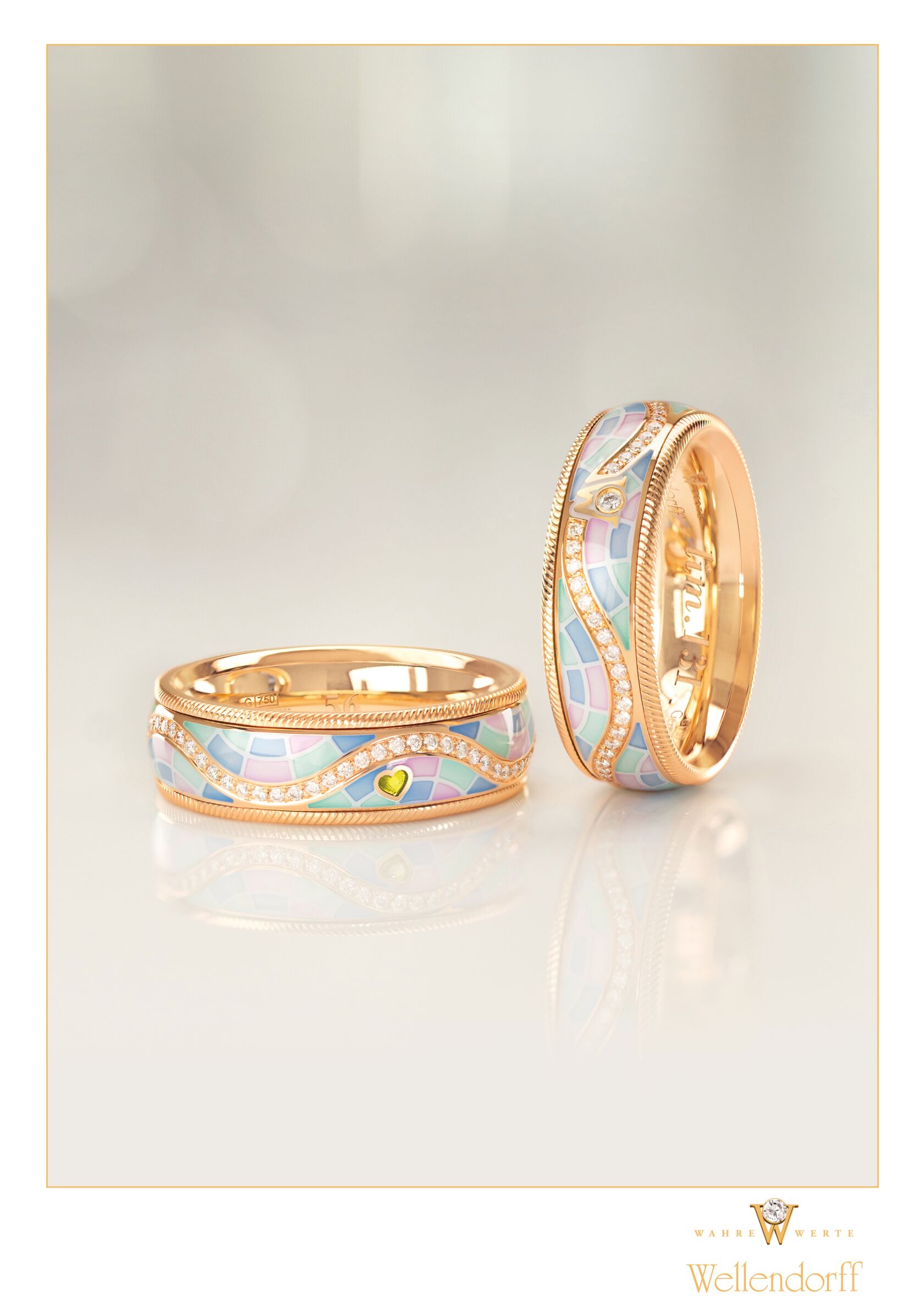 Die Kaltemaille, bestehend aus fünf Farben (Orange, Gelb, Grün, Türkis, Blau) mit einem fließenden Farbverlauf, verleiht dem Ring zusätzliche Dimension. Innengravuren, darunter die Standard-Wellendorff-Gravur und ein Schutzengel, komplettieren das Design. 73 Brillanten mit einem Gesamtgewicht von 0,226 ct setzen funkelnde Akzente.